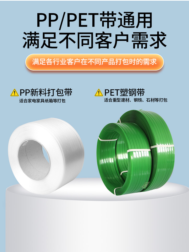 适合PP、PET带厚度: PP:0.4-1.2mm PET:0.5-1.0mm