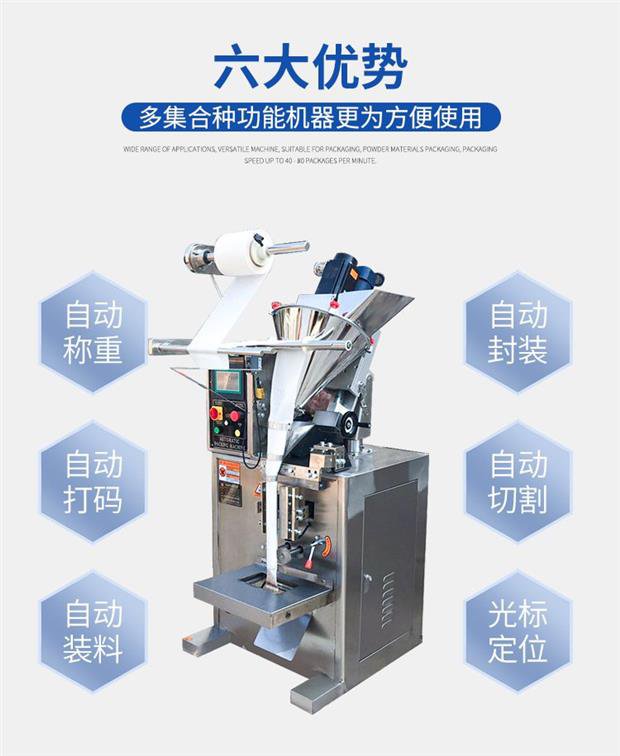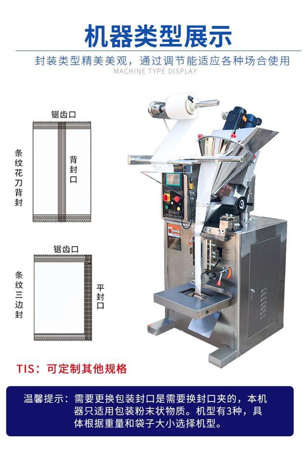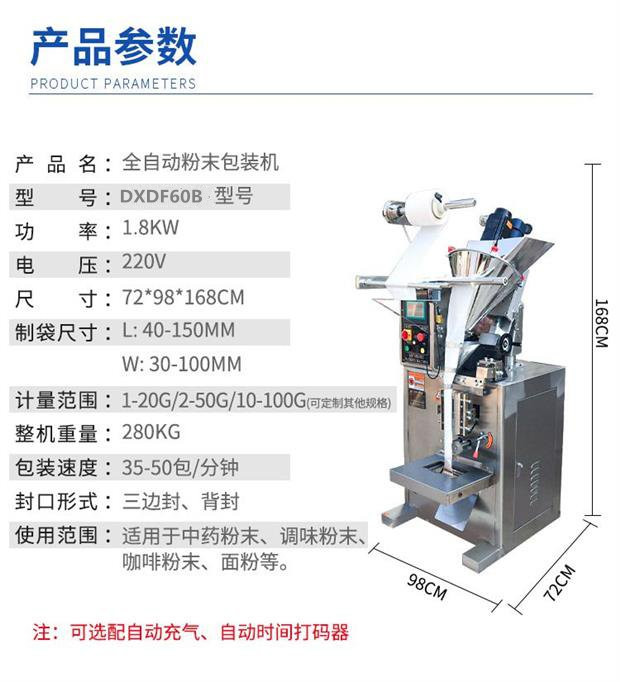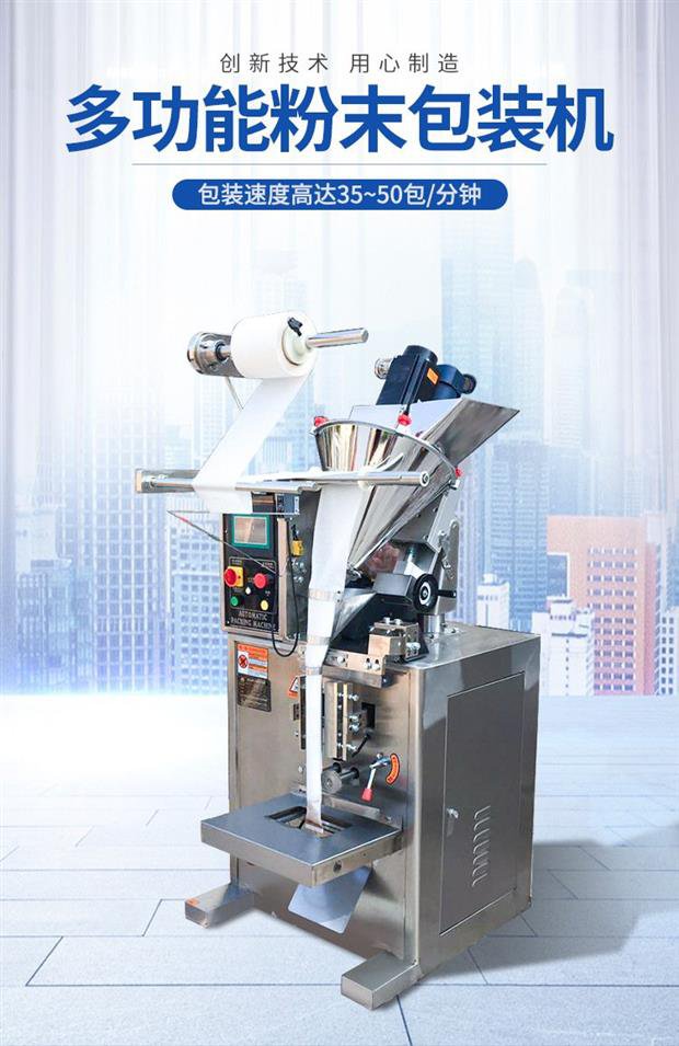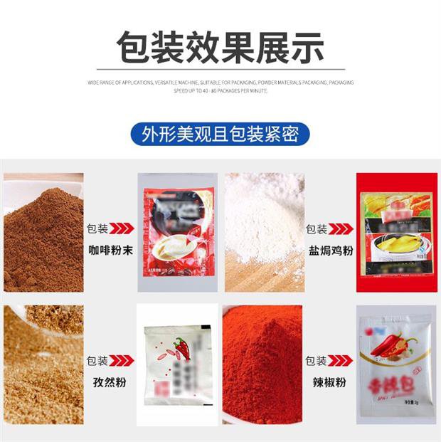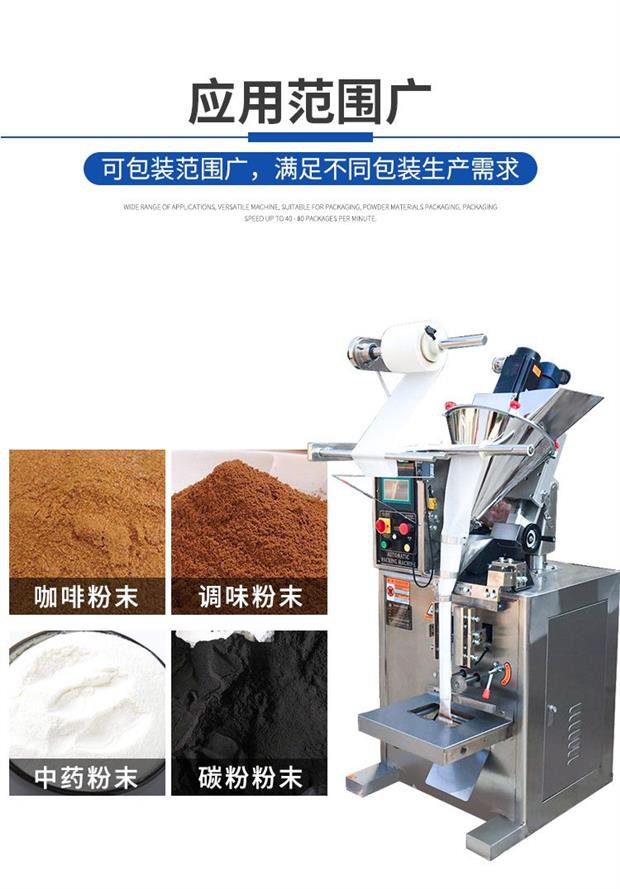 全自动粉末袋装包装机_小袋粉末包装机_葛根粉包装机使用范围:粉剂包装机适用包装粘性不大的粉状物如:灵芝粉、奶粉、豆奶粉、壮骨粉、藕粉、调味粉、魔芋粉、葛粉、杏仁粉、大麦粉、中药粉、保健粉、坚果粉、麦片、蛋白质粉、茶叶粉、等粉剂物料的自动包装.