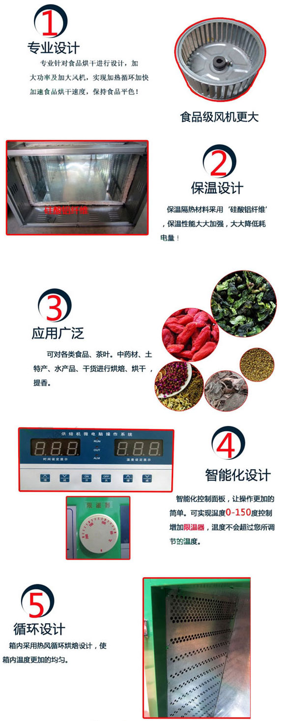 箱式烘干机适用广泛:适用于茶叶、食品、药材、蔬菜、谷物、瓜果、杂粮、中药石斛、金线莲,花茶等产品。