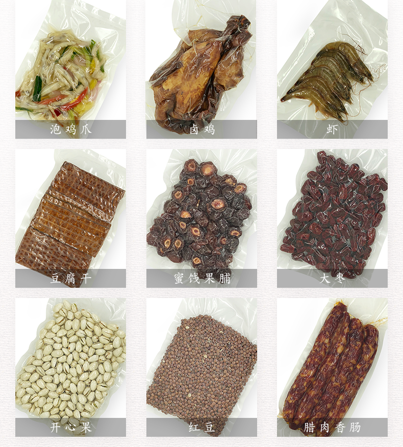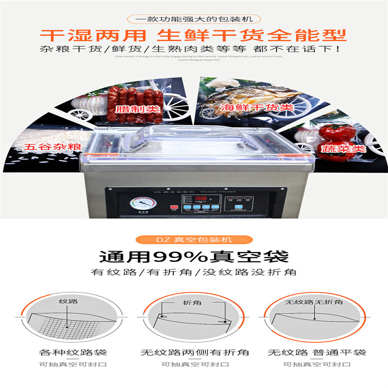 真空包装设备机构设计合理,操作方便,只需按下真空盖即自动按程完成真空、封口、印字、冷却、排气的全过程。适用于各种固体、液体、粉状、糊状产品的包装,如:牛肉粒、牛肉干、鸡腿、大枣、果仁、水产品、药品以及化工原料、电子产品(半导体、电路板、电子成品等)、金属加工件等等。经过包装后能够防潮、防氧化、防霉变虫蛀,并能延长产品的储存期限。