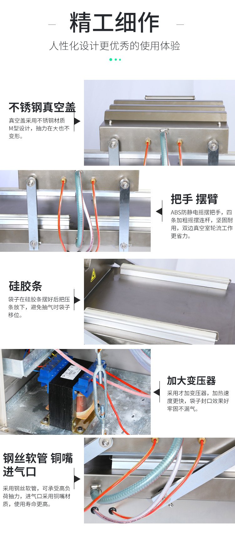 随着现代社会科技的发展,我们的生活变得越来越丰富多彩,以前我们如果没有吃完的食物该怎么办?是不是找个夹子把口封紧就可以,但是现在我们可以不用夹子就可以把食物封紧那就是真空封口机了,今天小编就给大家介绍一款好用的多功能封口机,那就是【食品真空包装设备】的多功能自动封口机,它采用的是变压器技术,加大了吸入力度减少了吸力的损耗,使吸力比第三代的真空机大幅提升; 这款真空封口机可以干湿软硬脆油通用的,用起来非常方便;同时它还拥有锁鲜的方式,轻松应对多种保鲜难题;智能一键操控设计,老人小孩都会用操作简单明了,让你摆脱繁琐;一体式机盖设计,方便清洁,不留死角;而且这款多功能真空机是通用所有袋子的,就像茶叶,米砖,铝箔袋等都可以使用,让你摆脱*袋的局限。同时它还是抽气的真空封口机手控真空,让抽气适可而止,充气可以防止在运输的途中受到压损,同时它还可以实现多包连封,让你一次连封多包小零食,方便又省力