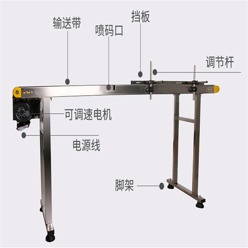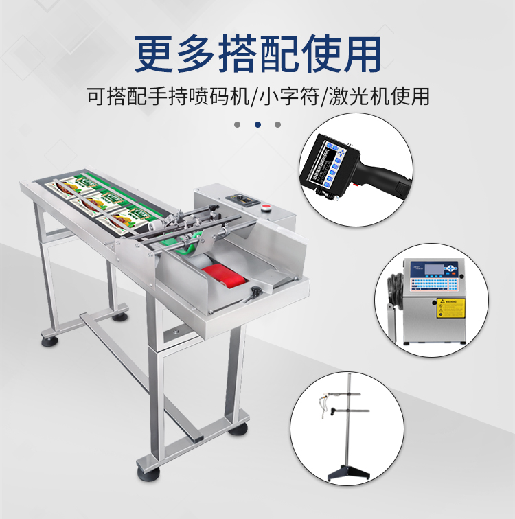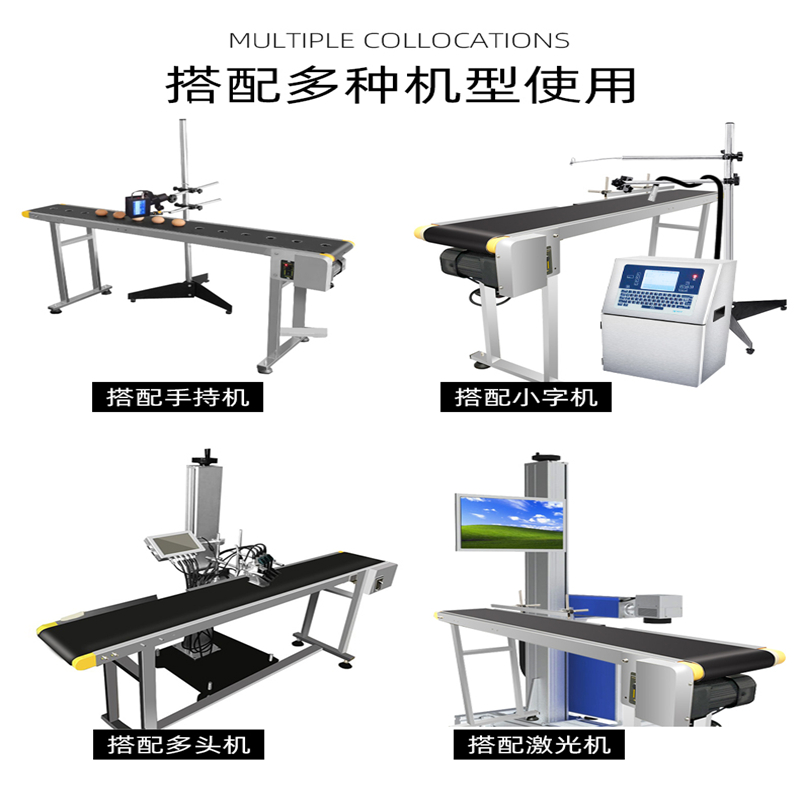 用途: 用于输送玻璃瓶、塑料瓶、金属罐、塑料袋、纸盒、纸袋、纸箱、标签等,便于喷码机或激光机进行喷印、喷刻生产日期、批号、防伪标记、图案等。