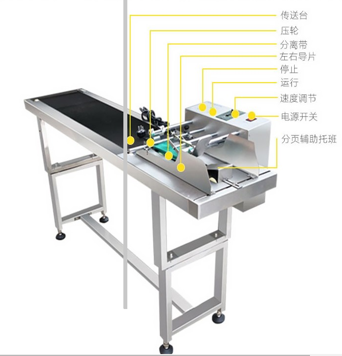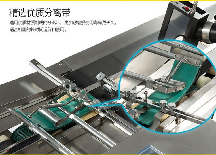 用于将成叠的包装袋或卡类自动分开,成单页传送到输送带上,便于喷码机或激光机进行喷印、喷刻生产日期、批号、防伪标记、图案等,从而减少人工分页的繁琐,充分发挥喷码机、激光机的高速喷印优点,提高喷印工作效率,并配备智能计数自动停机功能,方便生产管理