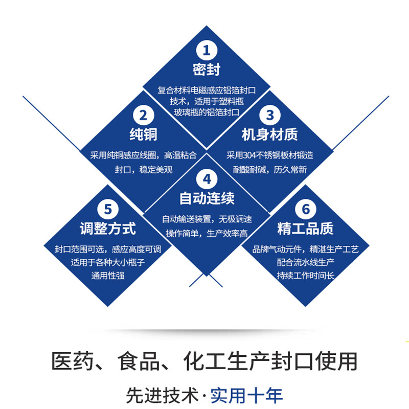 1.台式自动铝箔封口机用于医药、农药、食品、化妆品、润滑油等行业,是其*的封口设备。