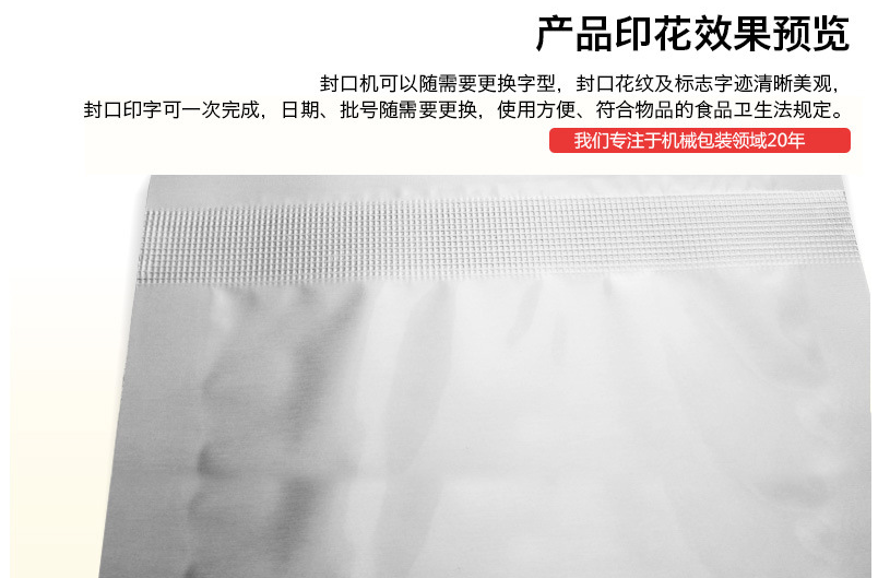 该系列封口机采用电子恒温控制和调速功能,具有自动连续封口、印刷产品标签、一次完成之功能,并可卧、立落地使用。用于单层薄膜及各种复合薄膜的封口、制袋,广泛应用在食品、制药、种子、化工、轻工等部门。