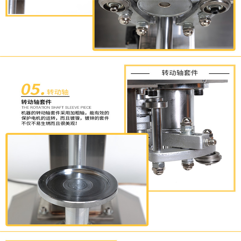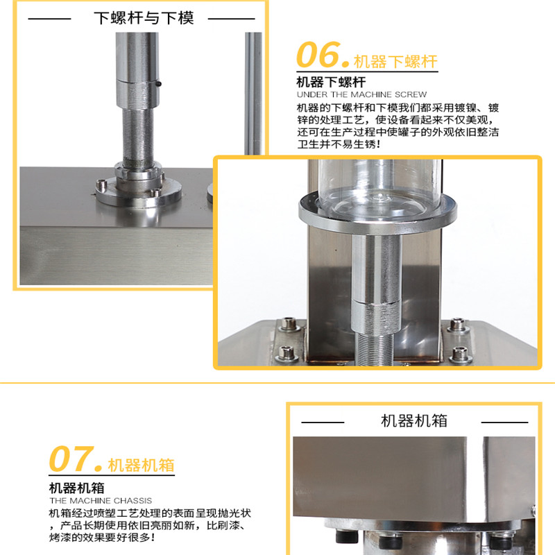 此款封罐机适用于各种PET塑料易拉罐。密封效果佳,罐口折边均匀无褶皱,无渗漏。操作简便轻巧,一人即可完成操作。