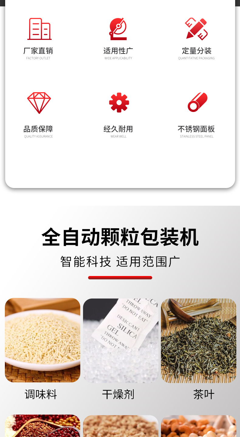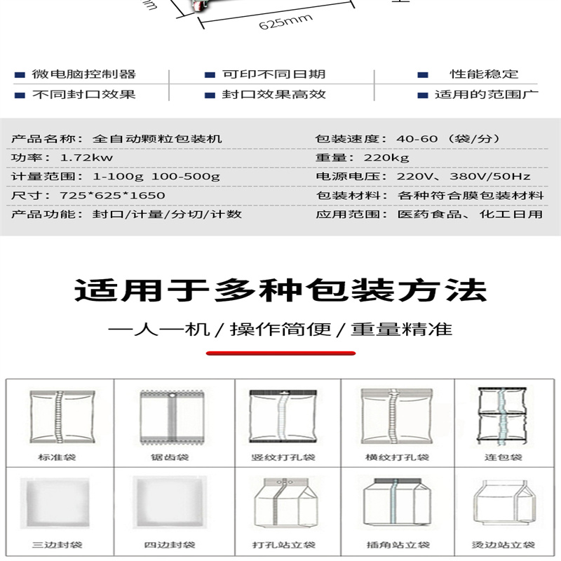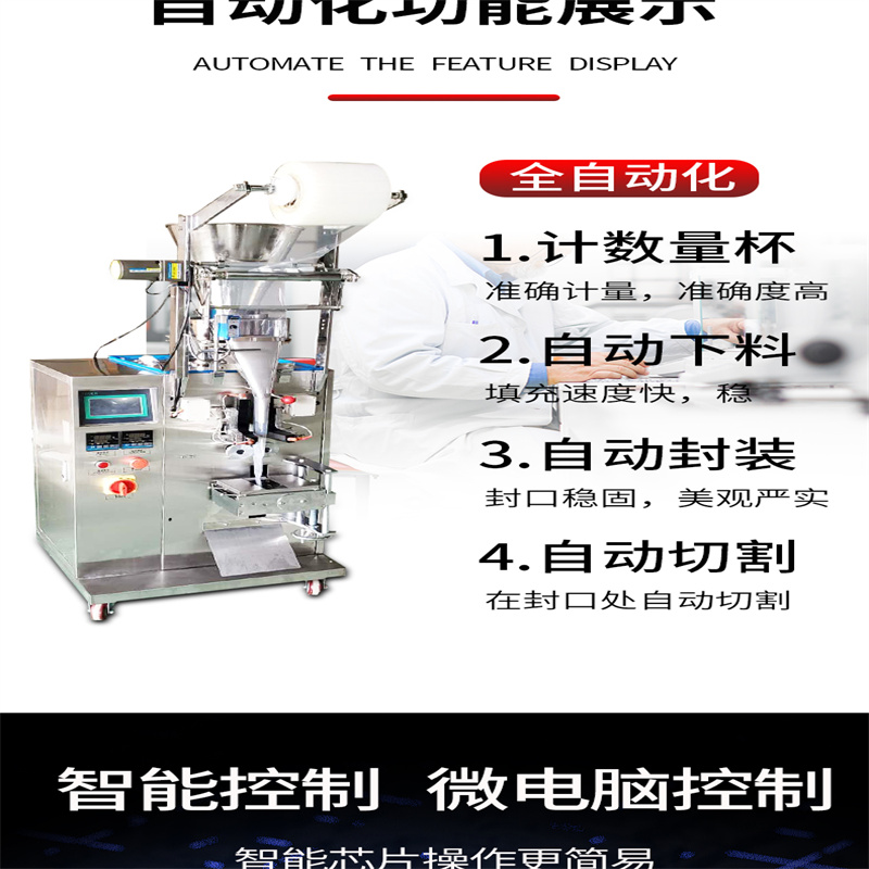 全自动颗粒袋装包装机_小包颗粒自动包装机_称重袋装颗粒包装机主要用于包装如下产品或类似产品:糖、味精、咖啡、果珍、食用盐等颗粒物料。