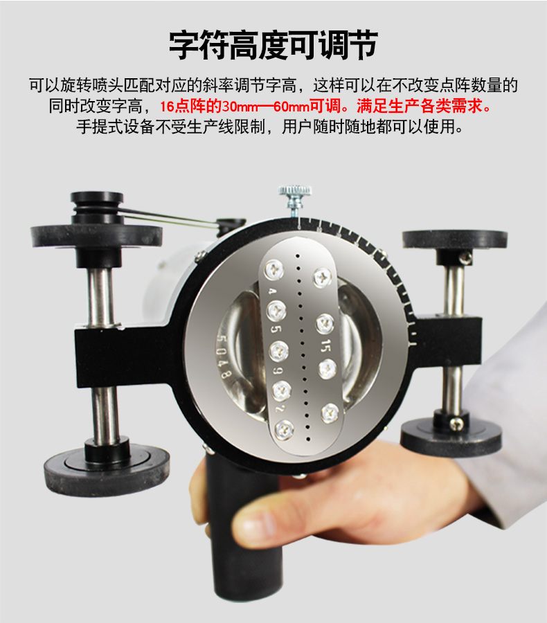 高度10—24mm区间任意调节, 宽度任意调节,可以喷印单行数字或英文
