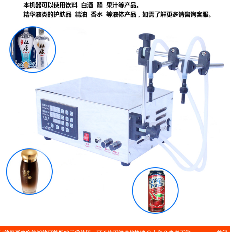 实验室水剂灌装设备 家用液体灌装机 瓶装液体灌装机采用微型电机自吸式泵,用微电脑来控制泵的工作时间以及间歇时间,定量自动灌装,自动设定灌装时间的设备。适用于5ml以上的微量液体的灌装,误差小。