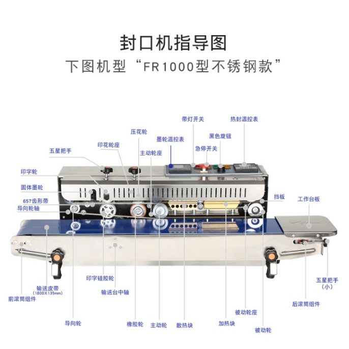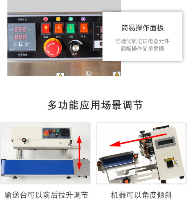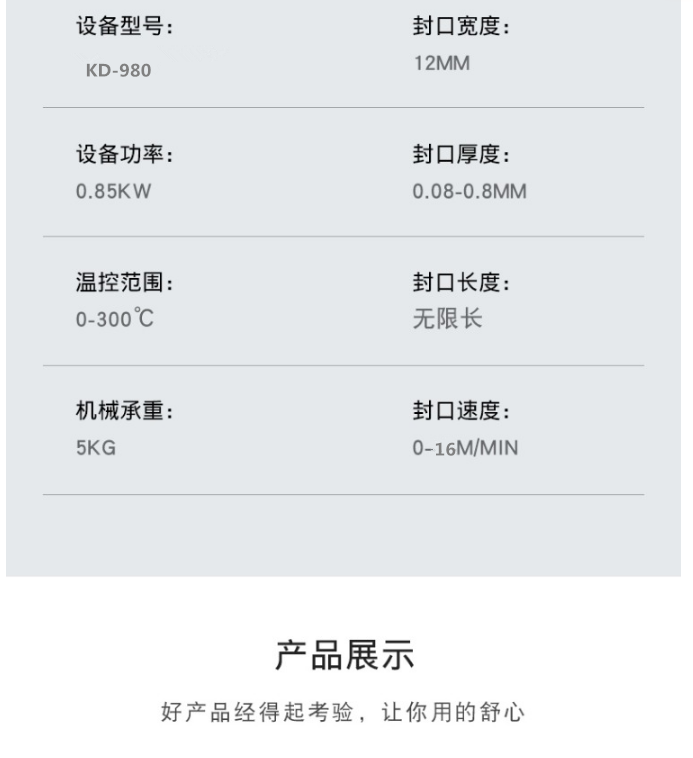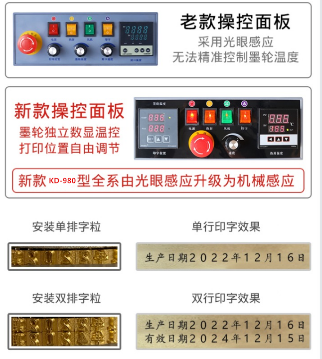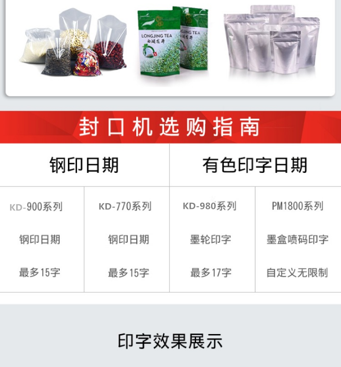 KD-980墨轮印字封口机 带打印日期自动封口机在封口的同时打印生产日期等文字;字迹采用墨轮印字 ,且字迹清晰,且不易被擦除和更改;瞬印瞬干,换字方便。本机采用恒温 控制自动输送装置,其封口长度不受限制,具体连续封口效率高,封口质量可靠结构合理,操作方便等特点。
