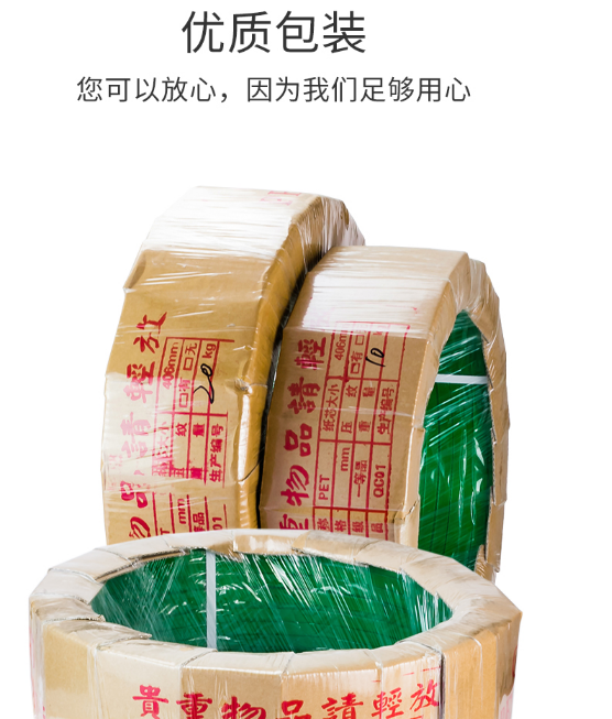 PET塑钢带是目前国际上* 流行的替代钢带、钢丝、PP带打包的新型环保包装材料。我司PET塑钢带具有“钉刺不裂、手撕不开、焊接口牢固”的好质量。采用德国进口技术生产的自动带、平整超大卷塑钢带、棉花带符合国家标准及美国AAR标准,可通用于所国内外高速自动打包机,打包带宽度可做9.5/12.5/16/19mm。现已广泛应用在木业、纸业、钢铁、化纤、棉花、铝锭、玻璃、建材、金属、烟草、电子电器、陶瓷等行业。