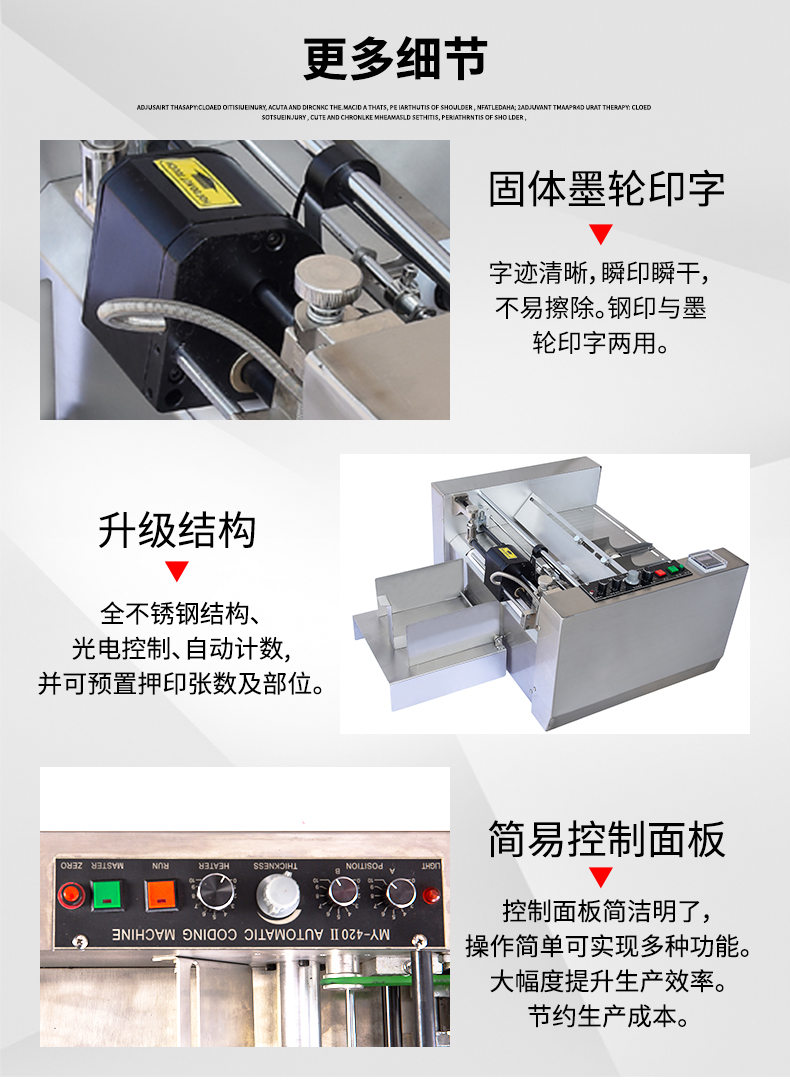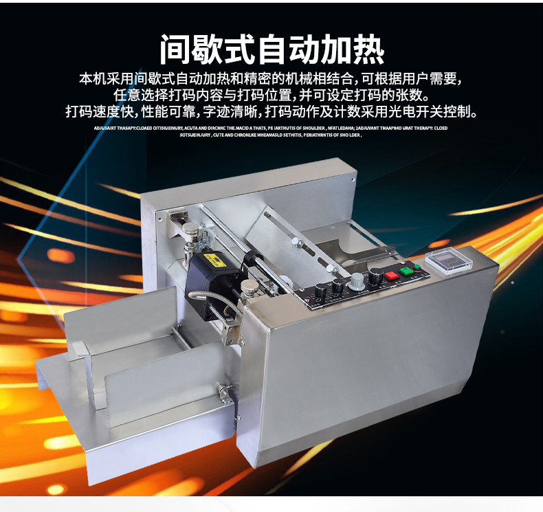 纸盒钢印生产日期批量打码机_钢印日期打印机_药盒日期钢印打印机采用光电一体化技术,适用于纸盒、标签、吊*、合格证、纸张、纸袋、塑料袋、薄纸板及非吸收性材料塑料薄膜、铝箔上等材料表面压痕或有色打印生产日期、产品批号、*期至、检验合格、公司名称等内容,具有自动分张、自动计数、随意定位、预先设定打印次数、压痕清晰、颜色可选、打印速度快、瞬印瞬干、损耗小等优点。机器可以实现一机两用, 当使用固体墨轮时,可以实现有色打印的效果。如果把固体墨轮取下,即可产生压痕印字的效果,而且压痕印字清晰,对被印物体厚度适应范围广,使用清洁对生产环境污染。一台机器同时实现两种不同功能。