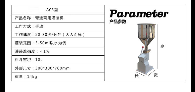 原理及特点: 该灌装机容量为50g, 使用时旋转容量调节钮,观看刻度表。指针对准你所需灌装的容量,然后扳动手柄试灌装。