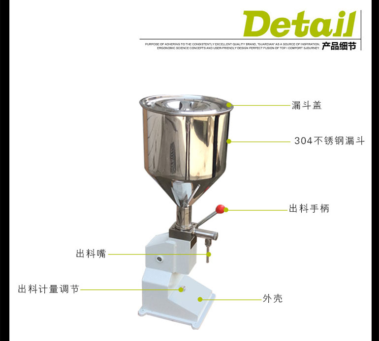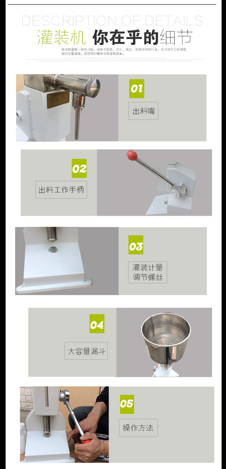 该系列灌装机为简易型膏液两用灌装机,也称为小型手动灌装机,适用于日用化学、医药、食品、化工等行业的膏体、液体定量灌装,也用于已封尾软管的定量灌装。具有操作简便,定量出料。并具有计量准确,结构简单等特点,采用不锈钢材料制成,符合食品、医药生产卫生要求。采用柱塞式定量充填装置,该机是通过调定柱塞运动的距离来实现物料定量*给,同时在计量范围内根据不同充填量做任意调节。